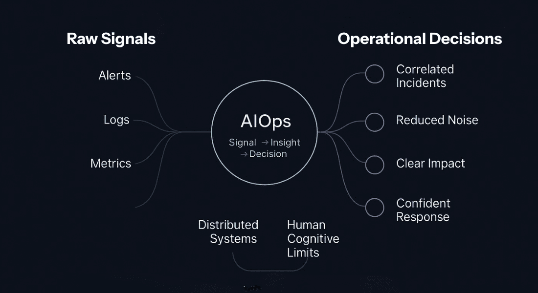 AIOps stands for Artificial Intelligence for IT Operations a modern approach that applies machine learning and analytics to help teams make sense of the massive amount of data produced by today’s systems. AIOps exists because modern systems generate more signals than humans can interpret in real time.