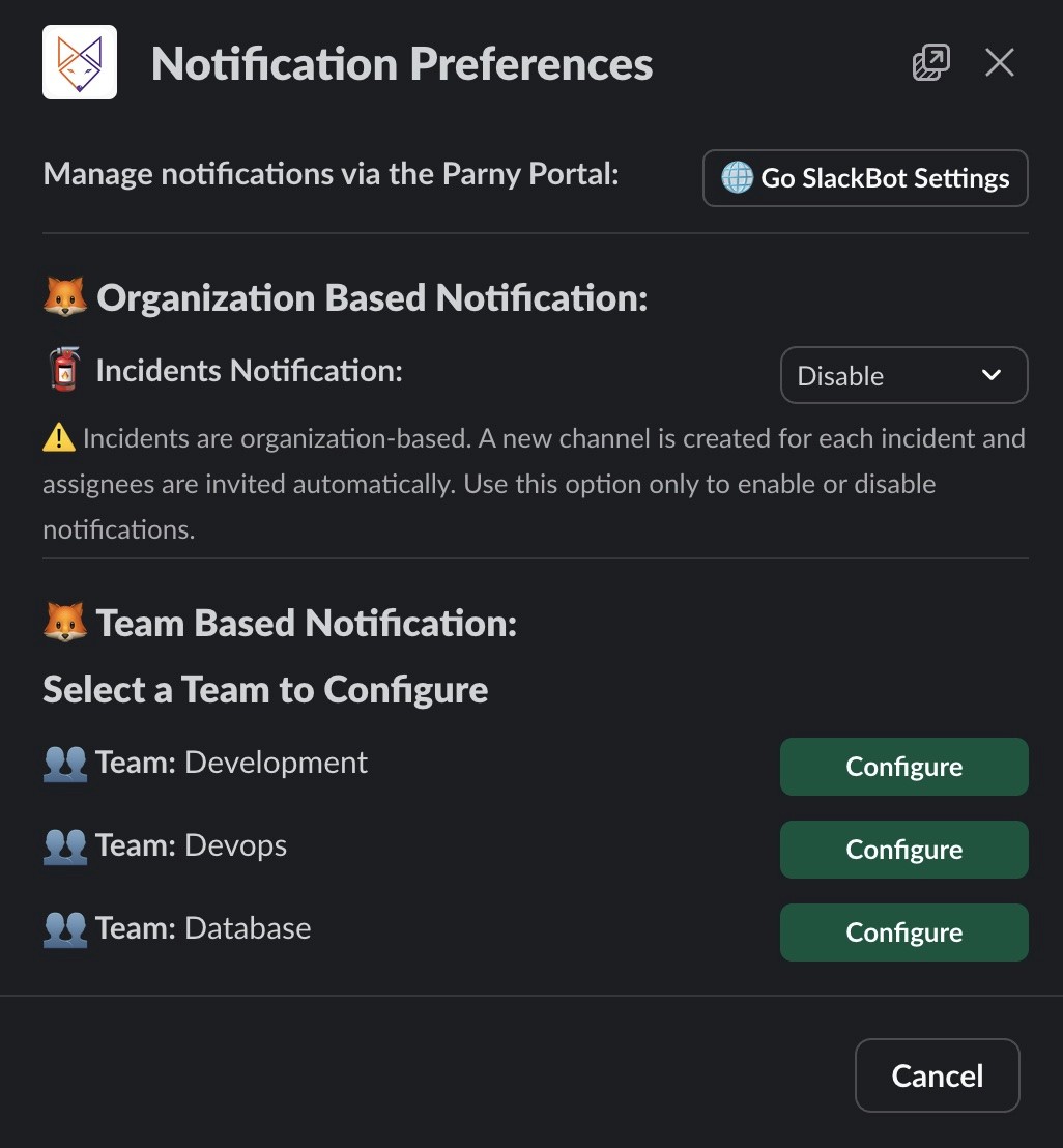 /parny notifications. (You can also configure these settings in the Slackbot Settings section of the Portal, in the same place where you installed the Slackbot.)