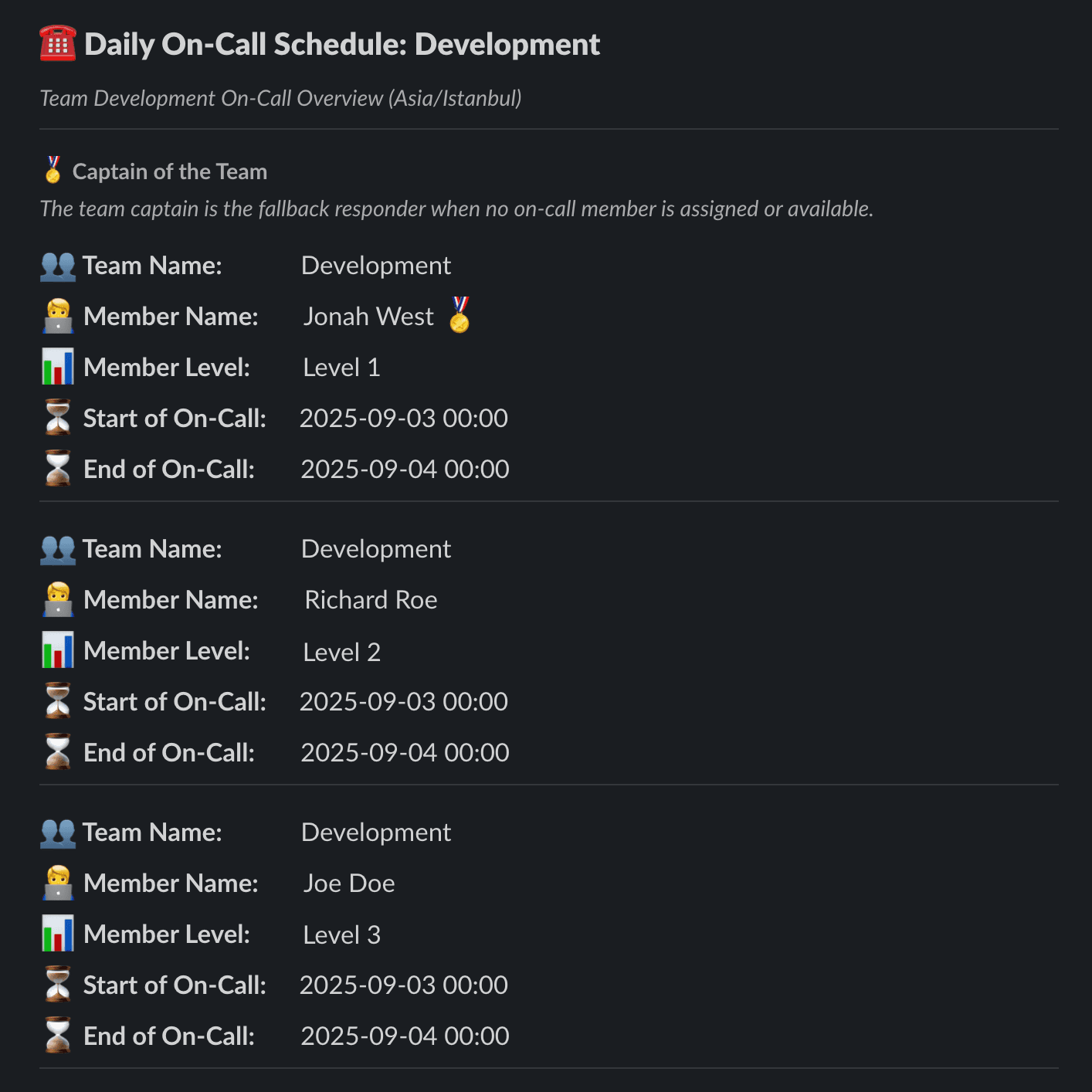 Stay in control of your team’s on-call schedules by checking who is on duty, reviewing daily rotations, or receiving automated updates about schedule changes.