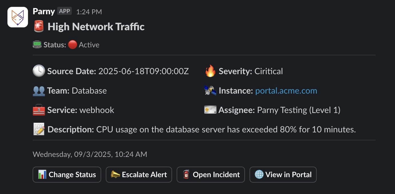 Transform your alert response and on-call management with Parny — the Slack-native bot that keeps your team aligned when it matters most. Parny Bot delivers powerful alert management and on-call coordination directly into Slack, eliminating context switching and helping your team act faster. It also works seamlessly with Parny Portal to accelerate response times.