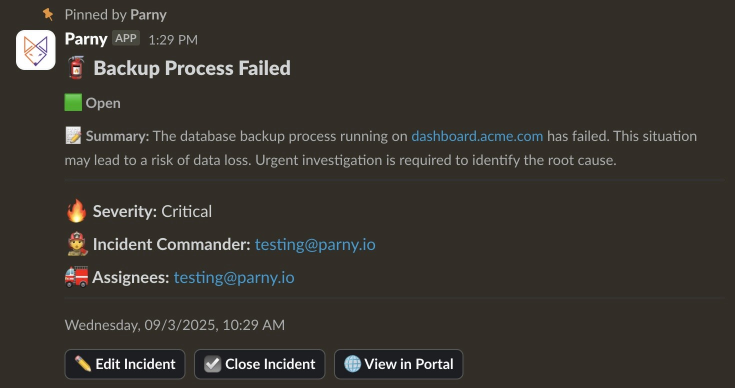 When alerts escalate into incidents, Parny Bot helps you open, edit, and close them with full documentation and proper tracking so your team can stay organized.